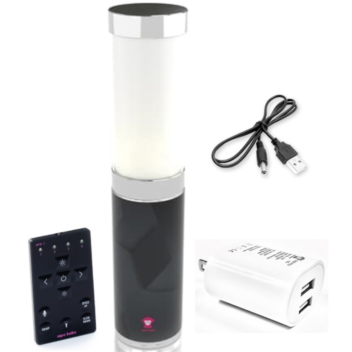 This set also includes the ApeRemote for direct RF control and a USB to DC charger for convenient charging of the fixture. In addition to remote control, the system supports smartphone app control and wireless DMX, while Ape Labs MusikMode makes it easy to create music-synced light shows with minimal effort.