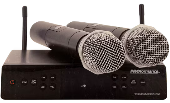 - Dual handheld wireless microphones