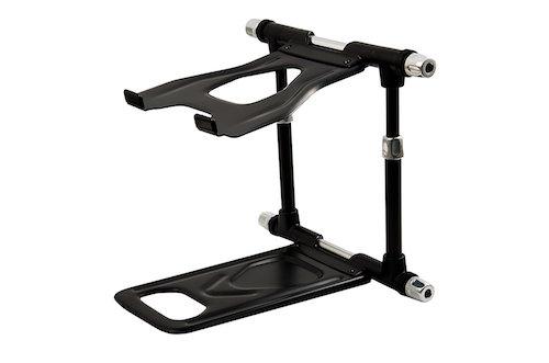The black Crane Stand Elevate from Crane Hardware is a robust and durable stand for laptops, tablets, controllers, projectors, or any other size/weight comparable electronic device. The Elevate uses a ratcheting action spline system, which requires much less torque to lock in a position when compared to previous incarnations of the Crane Stand. The lightweight aerospace materials include billet knobs and axles, which are reversible to accommodate left or right handed people. The Elevate ships with a faux-leather carry bag.