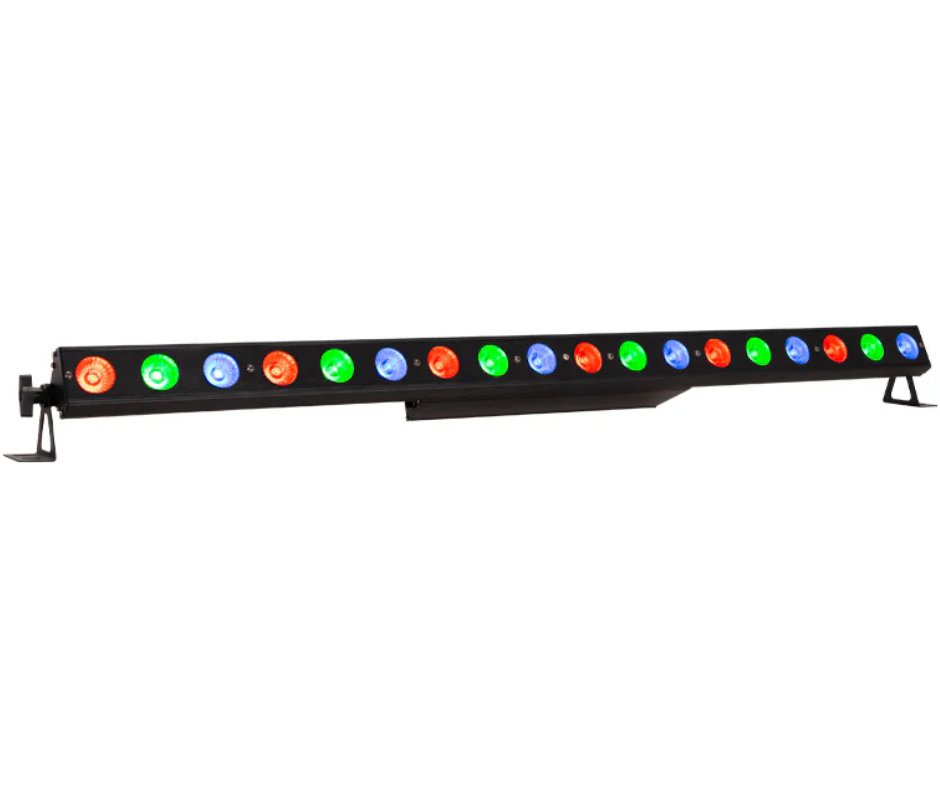 Eliminator Mega Color Q18 is a slim, 1-meter linear wash fixture that delivers vibrant color mixing and wide coverage for uplighting, wall washing, and stage effects. Featuring RGBA (red, green, blue, amber) LEDs, this compact bar produces rich hues and warm tones with smooth transitions—perfect for DJs, stages, clubs, and event venues seeking dynamic color output in a compact form.