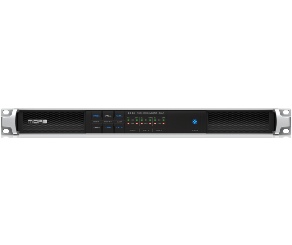 Midas MDS-AS 80 is a high-performance audio network converter that bridges a single high-bandwidth HyperMAC connection into two redundant 1 GBit connections—or vice versa—with ultra-fast failover switching. Engineered for touring-grade reliability, it supports up to 192 bidirectional channels at 96 kHz and integrates seamlessly into Midas systems including the HD96.