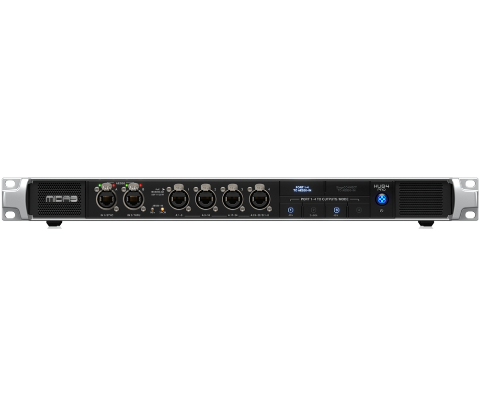 Midas MDS-HUB4 PRO is a powerful 96kHz personal monitoring hub designed for seamless distribution of audio and control signals in complex stage environments. Built to serve as a central connection point, it offers both analog and digital outputs for various monitoring applications, making it an ideal solution for side racks, in-ear monitor setups, and stagebox integration.