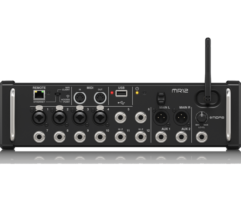Midas MR12 is a compact, rackmountable 12-input digital mixer designed for wireless control via iPad, Android, or PC. Engineered for portability and professional-grade audio performance, it’s ideal for small venues, live gigs, home studios, and corporate events. With its integrated WiFi, high-quality preamps, and multi-platform remote apps, the MR12 brings the power of digital mixing to any setup—without the need for external hardware.