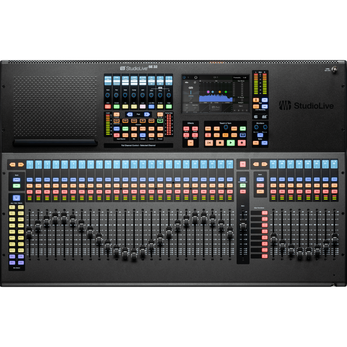 Designed for demanding live environments, the SE32 features 33 touch-sensitive motorized faders for hands-on control and fast mix adjustments. The integrated Fat Channel processing includes a full suite of vintage-modeled EQs, compressors, limiters, and reverb effects, giving engineers the tools needed to shape professional mixes in any setting.